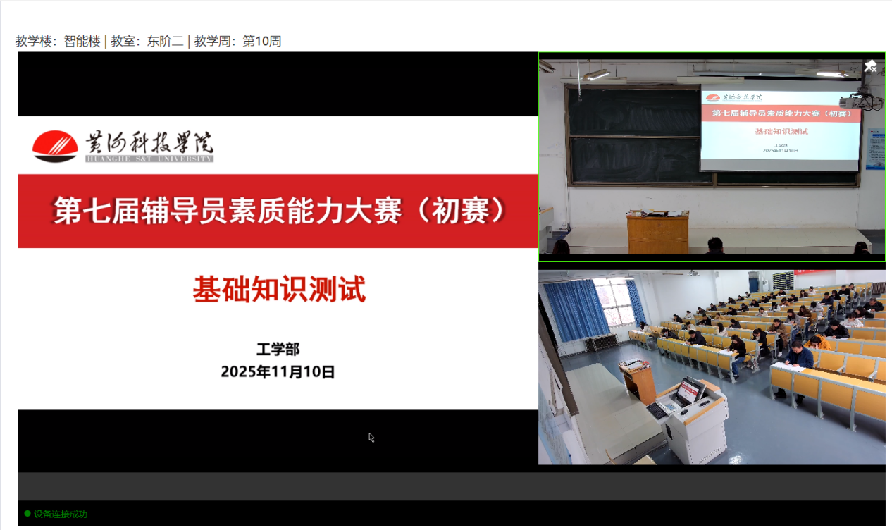 11月10日下午,大赛首场环节——基础知识测试在智能楼东阶二正式启动。本环节采用云监考、闭卷考核形式,重点考察辅导员对党的创新理论、学生工作政策法规等内容的掌握情况。考场上,参赛辅导员沉着应答、认真作答,展现出扎实的职业素养。考核结果显示,辅导员业务知识掌握总体精准,在理论知识学习方面仍需持续深化、查漏补缺。
