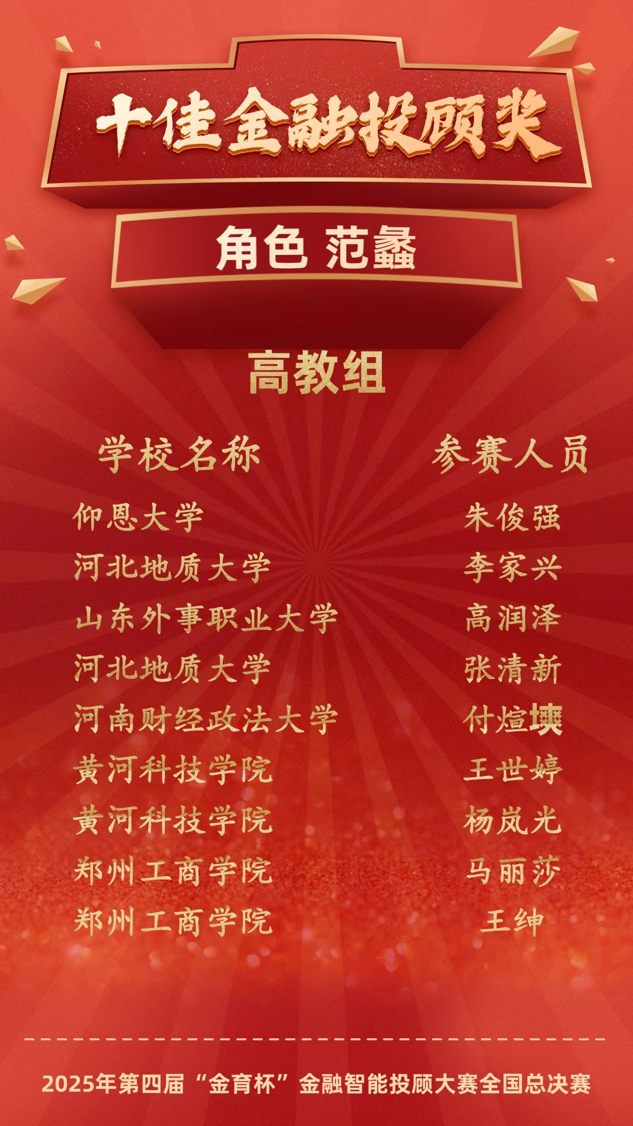 本届大赛由《当代金融家》杂志社主办,由金智东博(北京)教育科技股份有限公司承办和提供技术平台支持,竞赛吸引了全国130余所高校,近4000名学子参与角逐。在备赛过程中,由卫亚杰、潘丽丽两名老师悉心指导的李羿凯、杨岚光等四名同学,凭借扎实的专业功底和出色的团队协作,在“财富人生”理财实战沙盘模拟赛中展现了优秀的资产配置能力和风险管控水平,荣获全国一等奖,另一支由陈宝戈、王世婷等四名同学组成的参赛团队也获得全国二等奖的佳绩。参赛选手刘瀚、王世婷、杨岚光在各自所在的分角色个人赛中均获取十佳投资顾问奖!