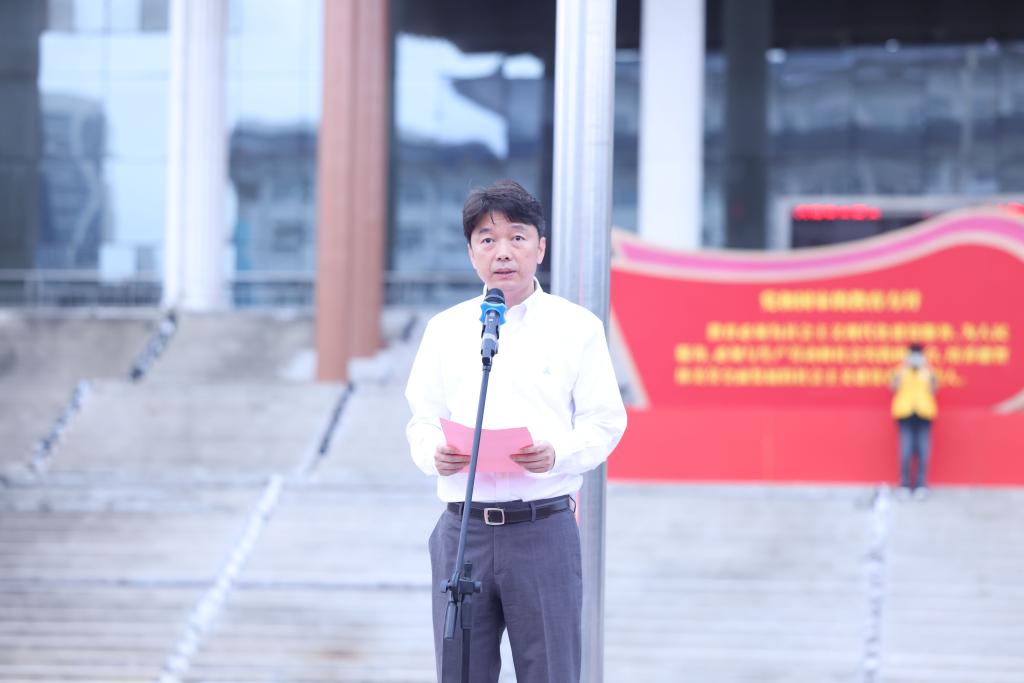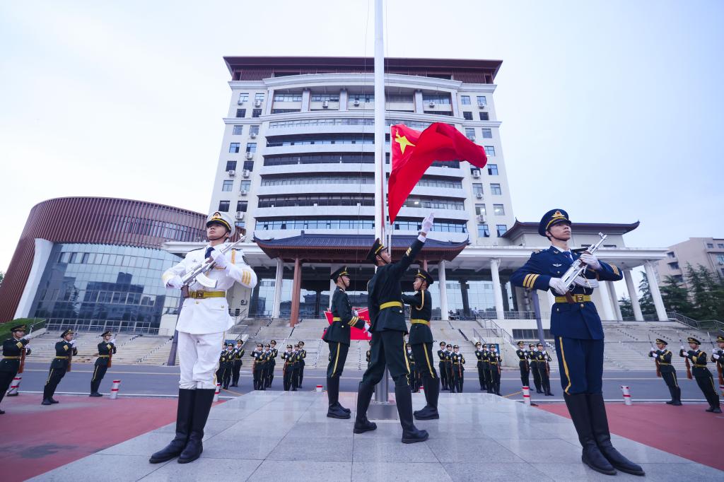 伴随着铿锵激昂的《义勇军进行曲》,鲜艳的五星红旗迎风升起,现场全体师生肃立行注目礼,浓浓爱国情怀在心中激荡。