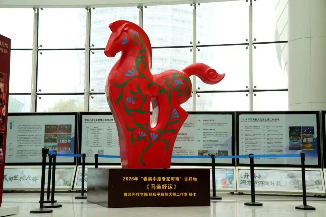 岁序更替,“艺”启新春。由河南省文旅厅主办、河南省文化馆承办、各省辖市文广旅局协办的2026年“春满中原·老家河南——文化馆里过大年”系列文化活动在2026年2月10日(阴历小年)启动,我校教授、雕塑家杨庆平专为此次活动创作的生肖吉祥物雕塑《马年好运》惊艳亮相。这也是他连续第十八年为该活动深耕生肖创作,以艺术之力传承中原文脉,传递新春祝福,为活动增添了浓厚的文化气息与吉祥意蕴。
