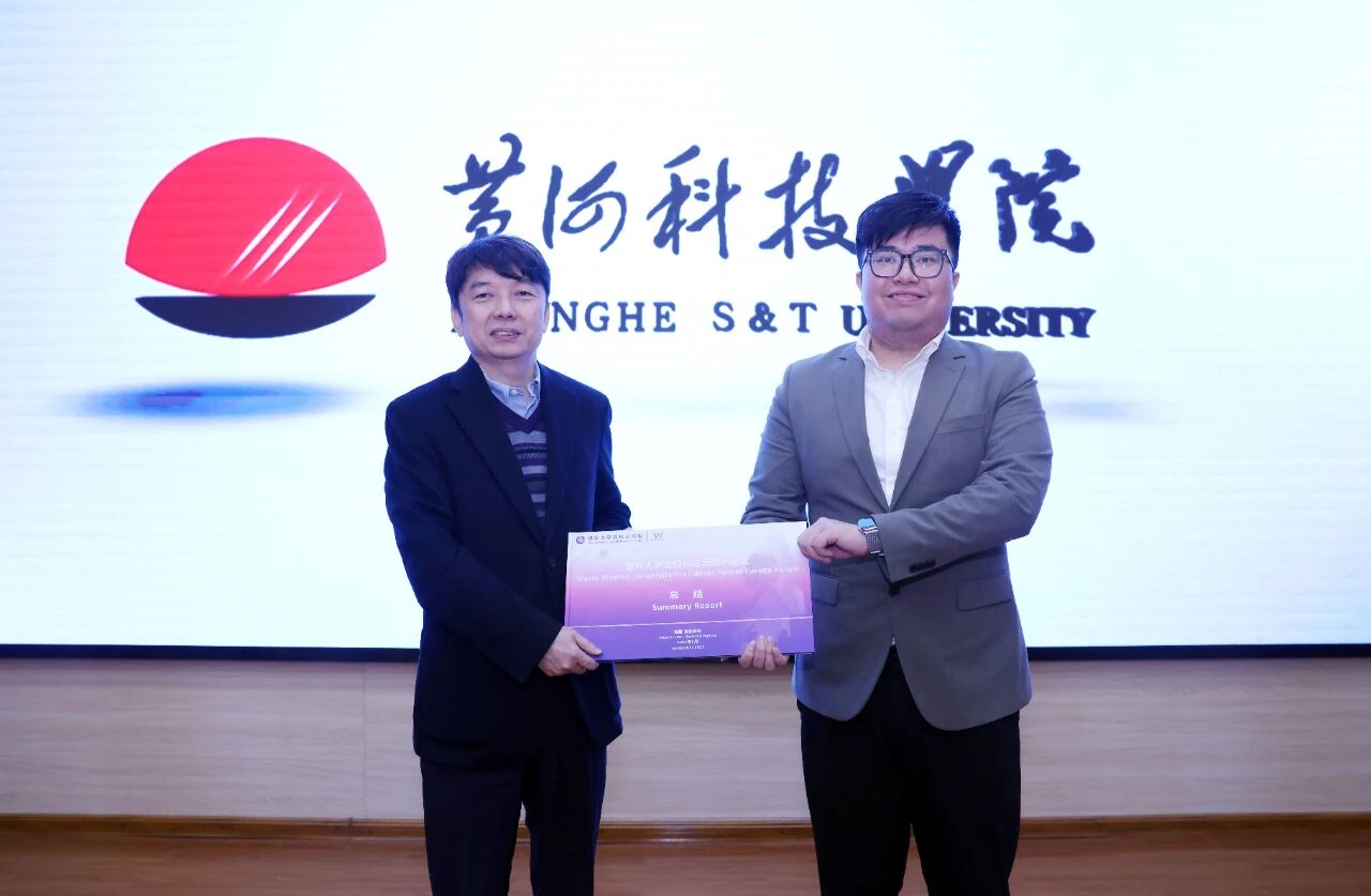 胡大白董事长介绍了学校的办学优势与特色。杨保成校长阐述了我校近年来创新提出的“产业教育化”理念,介绍学校围绕“1248”发展战略,在体制机制、教育教学、学生工作与数字化转型等四项改革方面的做法、成效与未来目标。曹丞曦主席对此表示高度认同,并指出双方在零碳校园建设、运动校园建设、学科制改革及未来大学目标四个方面存在诸多相似、相通之处,黄科大的办学精神、理念与创新实践值得学习。