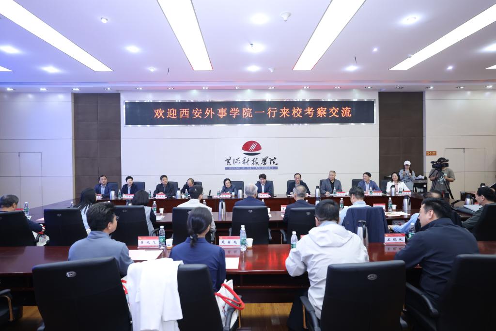 4月14日,西安外事学院理事长、校长黄藤一行15人来校考察交流。我校董事长胡大白,执行董事、校长杨保成,副校长罗煜,财务处、教务科研处、科技发展部、党办、学生中心、校办、国际交流中心等有关部门负责人接待来访客人。
